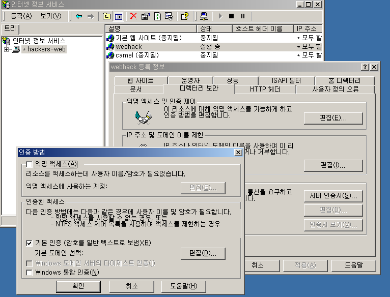 인터넷 정보 서비스 - webhack 등록정보 - 디렉터리 보안 - 익명 액세스 및 인증 제어 편집
