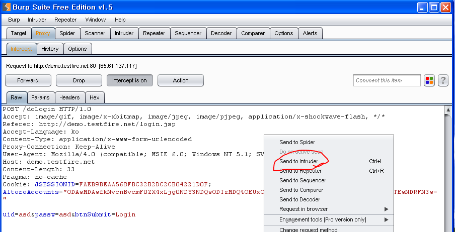 3) request packet를 우클릭 send to intruder