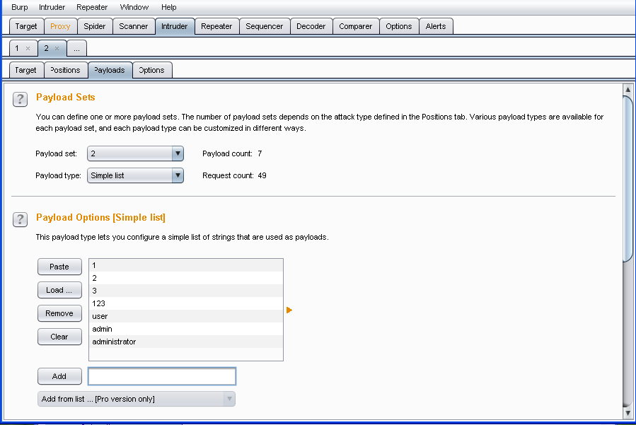1, 2 payload set 모두에 집어 넣어 준다.