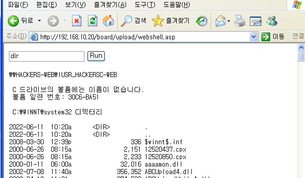 http://192.168.10.20/board/upload/webshell.asp 접속