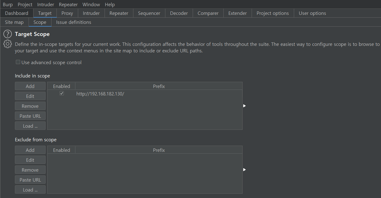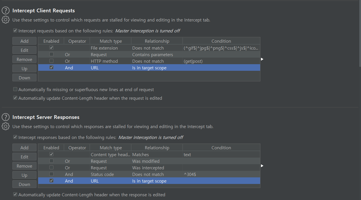 burp suite에서 Target - Scope 값에 공격하려는 페이지를 지정한 뒤 Proxy - Option에서