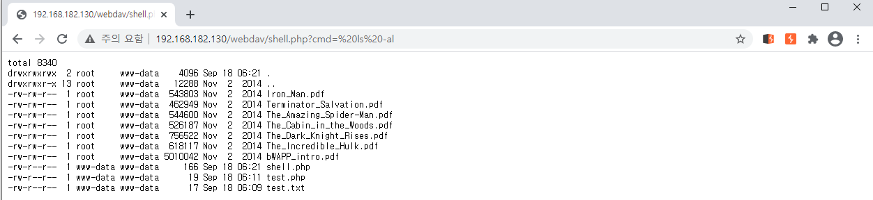 안에 들어 있는 코드를 body로 해서 php 파일을 만들어 PUT 하고 웹쉘을 동작시킨다.