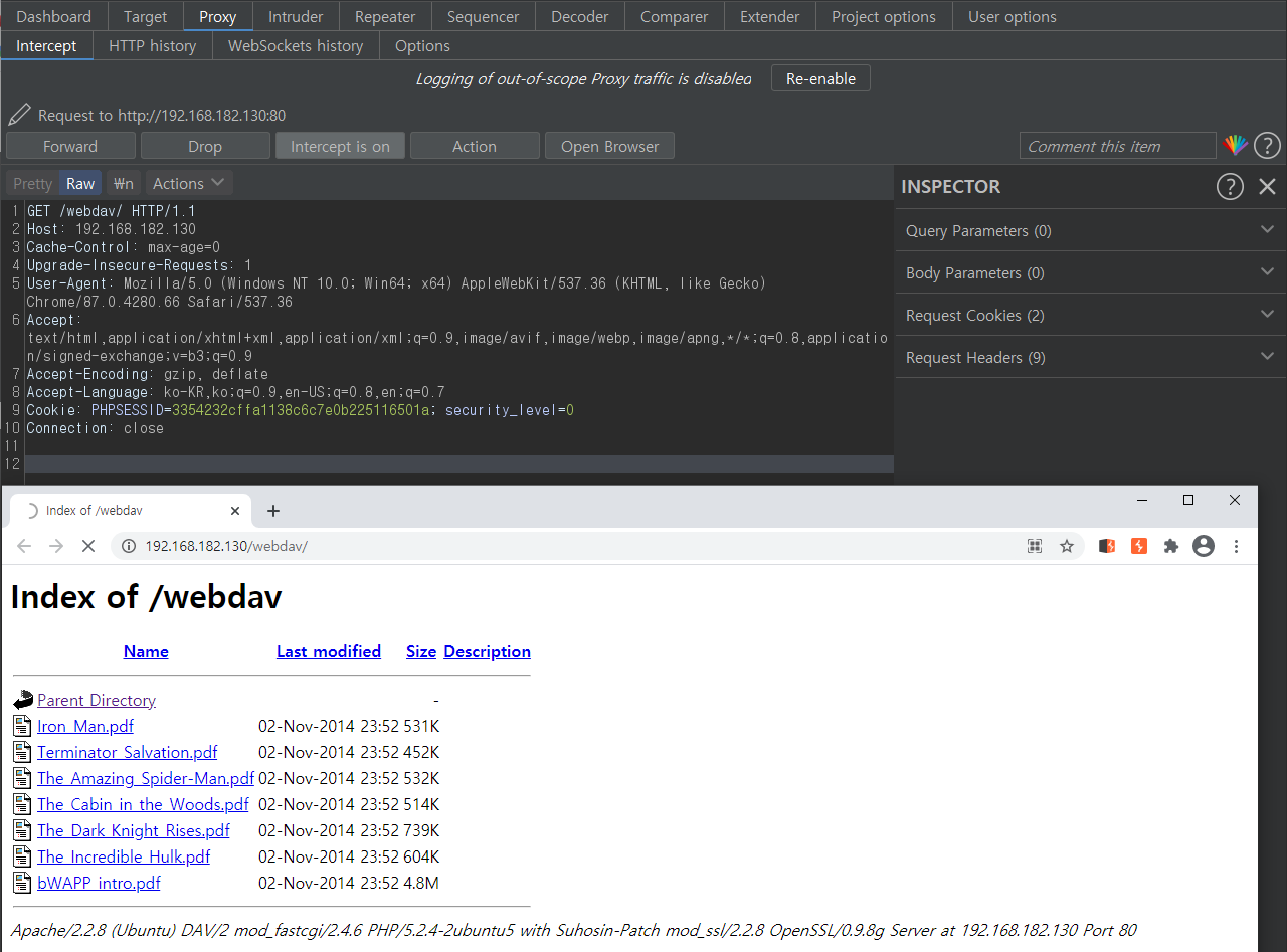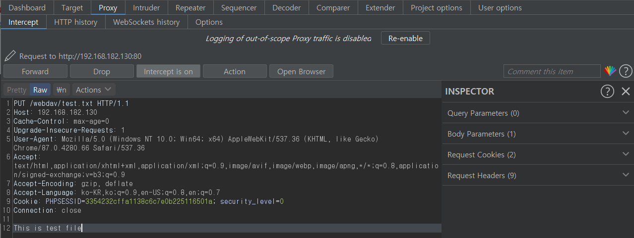Intercept를 on 하고 index of 취약점 페이지를 다시 들어가 보면