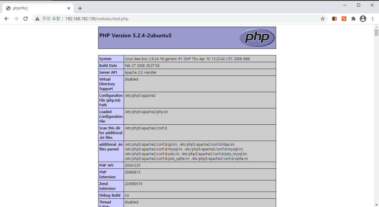이번에는 같은 방법으로 php 파일을 PUT해보면 php 파일이 만들어지고 클릭하면 php info page가 나온다.