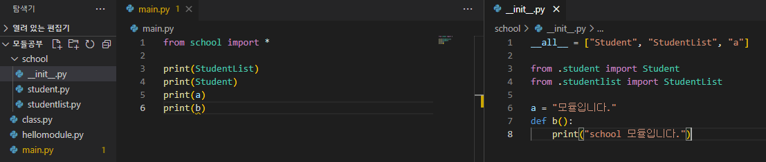 from school import * 을 이용해서 바로 사용할 수 있도록 전체 모듈을 불러오게 되는데,